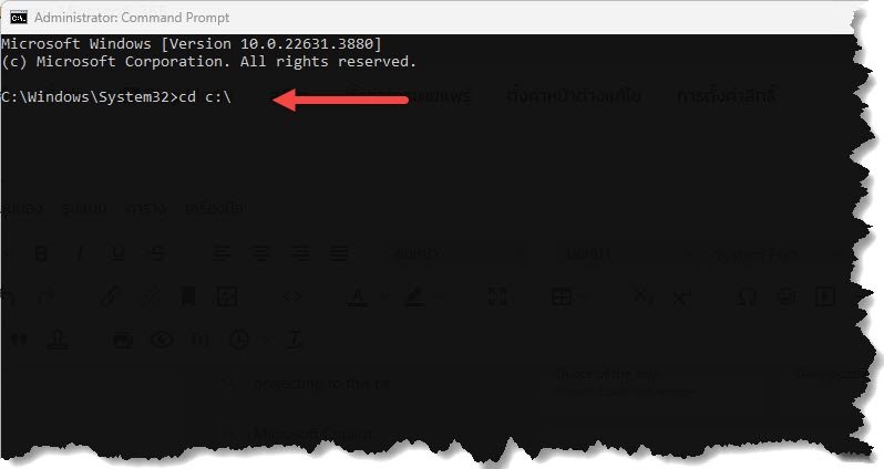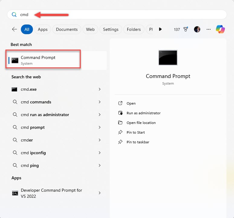 - ไปที่สัญลักษณ์ แว่นขยาย พิมพ์ cmd เพื่อเปิด Command Prompt