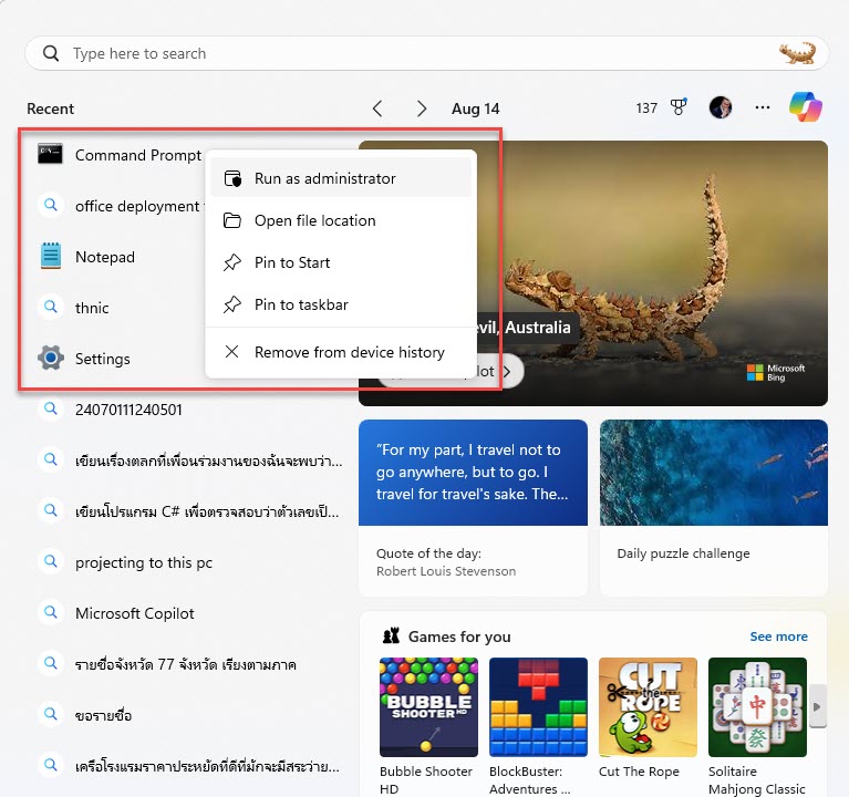 - ให้คลิกปุ่มขวาของเมาส์ที่คำสั่ง Command Prompt > Run as administrator